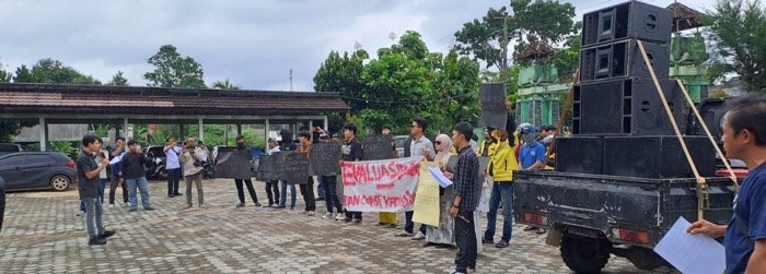 “Ini bukan soal retak atau lubang kecil. Jalan dan jembatan rusak, kecelakaan pun terjadi. Lalu siapa yang bertanggung jawab?” teriak salah seorang orator dalam aksi di halaman Kantor Dinas SDABMBK, Rabu, 12 Januari 2025.