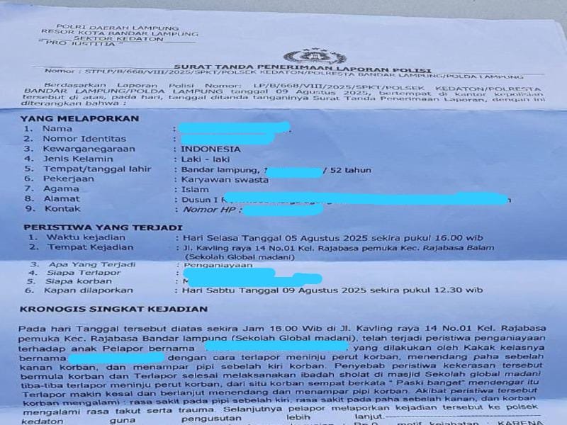 BANDARLAMPUNG, – Diduga terjadi bullying secara berkelanjutan di dalam lingkungan Sekolah Global Madani. RH orang tua korban, Sabtu (09/08/2025) akhirnya melapor ke Polsek Kedaton.