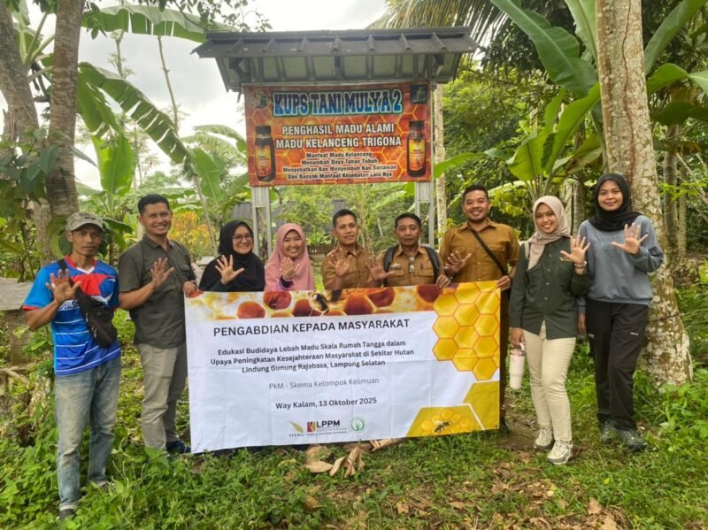 LAMPUNG SELATAN – Tim Dosen dan mahasiswa dari Program Studi Rekayasa Kehutanan, Institut Teknologi Sumatera (ITERA), menggelar program edukasi dan pendampingan untuk pengembangan budidaya lebah madu klanceng (Trigona sp.) bagi Kelompok Usaha Perhutanan Sosial (KUPS) Tani Mulya 2 di Desa Way Kalam, Lampung Selatan.