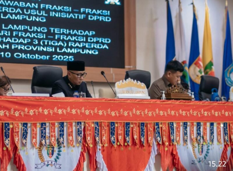 BANDARLAMPUNG, – Gubernur Lampung, Rahmat Mirzani Djausal, berharap bahwa pembahasan tiga Raperda prakarsa Pemerintah Provinsi Lampung dan enam Raperda usul inisiatif DPRD dapat segera dilanjutkan ke tingkat berikutnya sesuai jadwal yang telah disepakati. Hal ini disampaikan dalam Rapat Paripurna DPRD Provinsi Lampung, Jumat (10/10/2025).