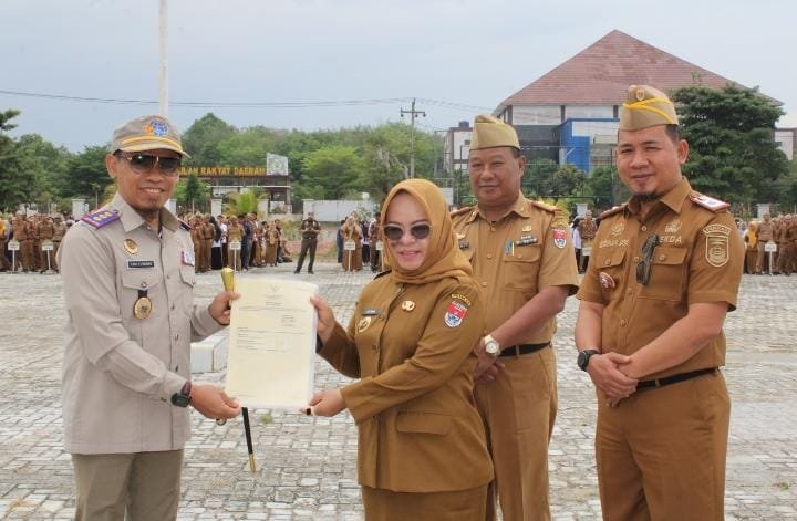 MESUJI – Kepala Kantor Pertanahan Kabupaten Mesuji, Endi Purnomo, menyerahkan sebanyak 30 (tiga puluh) Sertipikat Hak Pakai Tanah Barang Milik Daerah (BMD) Pemerintah Kabupaten Mesuji. Penyerahan dilakukan secara langsung kepada Bupati Mesuji, Hj. Elfianah, S.E., pada saat pelaksanaan Apel Mingguan di Halaman Kantor Pemerintah Kabupaten Mesuji, Senin (29/09/2025).