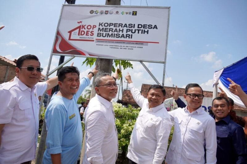 Menteri Koordinator Bidang Pangan Zulkifli Hasan didampingi Wakil Menteri Dalam Negeri (Wamendagri) Bima Arya Sugiarto dan Wakil Menteri Kelautan dan Perikanan, Didit Herdiawan, hadir langsung untuk meresmikan Koperasi Desa/Kelurahan Merah Putih Bumisari, Kecamatan Natar, Kabupaten Lampung Selatan, Provinsi Lampung (28/5/2025).