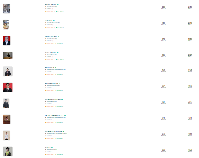 Berdasarkan data SINTA yang diakses pada 20 Januari 2026, berikut sepuluh peneliti UIN Raden Intan Lampung dengan skor 3Yr tertinggi: