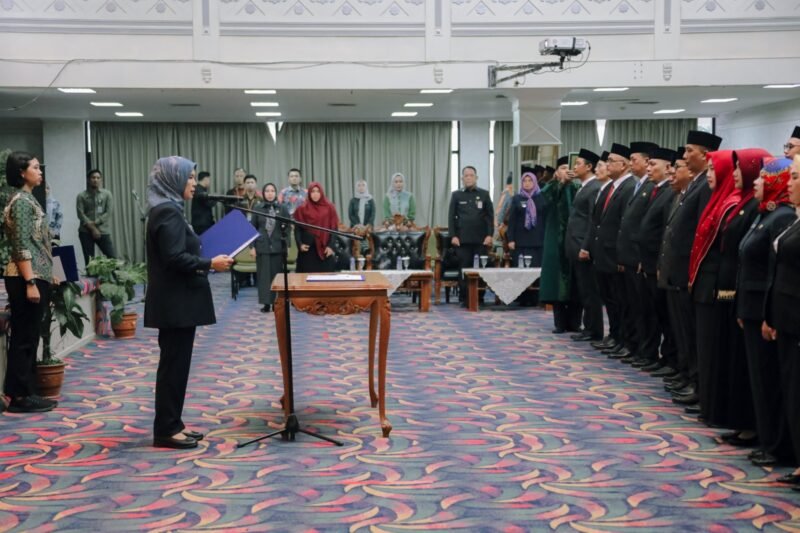 BANDARLAMPUNG – Inspektur Provinsi Lampung Bayana, mewakili Gubernur Lampung Rahmat Mirzani Djausal, melantik 18 Pejabat Administrator, 28 Pejabat Pengawas dan 13 Pejabat Fungsional di Balai Keratun Lt. 3, Kompleks Kantor Gubernur Lampung, Jumat (10/10/2025).