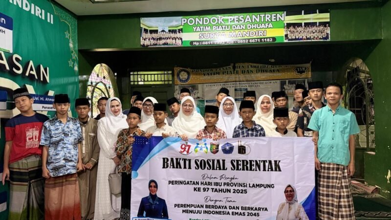 BANDAR LAMPUNG – Rangkaian Peringatan Dewan Pimpinan Wilayah Majelis Taklim Perempuan (MTP) Ikatan Persaudaraan Haji Indonesia (IPHI) Provinsi Lampung, menggelar Bakti Sosial di Pondok Pesantren Surya Mandiri di Jalan Pagaralam (PU) Bandar Lampung, Jumat (19/12/2025).