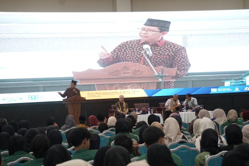Bandar Lampung – Rektor Universitas Islam Negeri (UIN) Raden Intan Lampung, Prof. H. Wan Jamaluddin Z., M.Ag., Ph.D., membuka 1st International Conference on Halal, Science, Technology and Innovation (IC-HaSTI) dengan sambutan yang disampaikan dalam tiga bahasa asing yakni Inggris, Rusia, dan Arab. Momen tersebut menarik perhatian peserta konferensi dan mahasiswa yang hadir di Ballroom UIN Raden Intan Lampung, Rabu (5/11/2025).