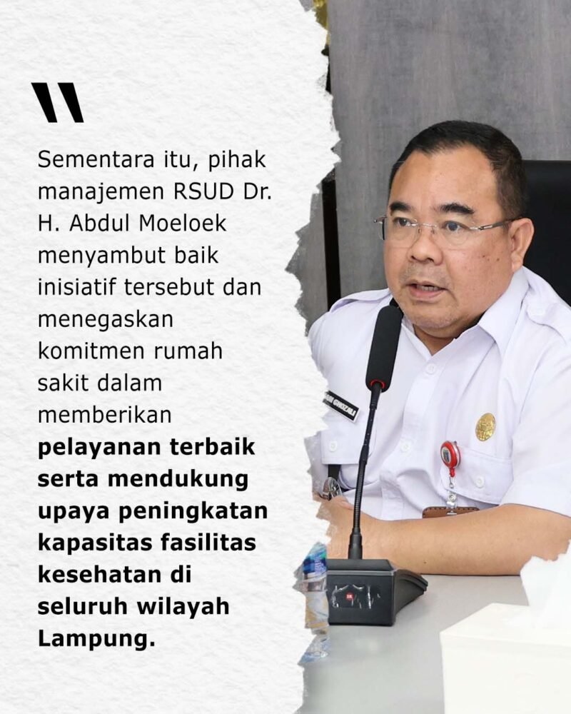 Direktur RSUD Dr. H. Abdul Moeloek, dr. Imam Ghozali menyambut baik kerja sama ini dan menegaskan komitmen rumah sakit dalam mendukung pelayanan kesehatan di seluruh wilayah Lampung.