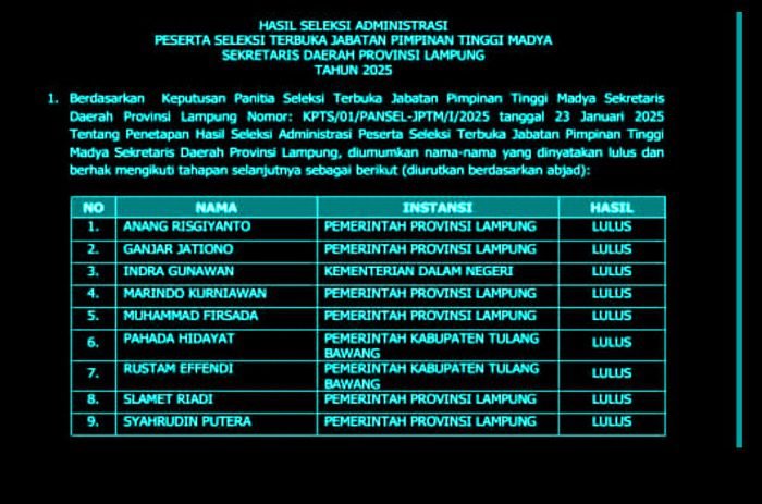 AKHIRNYA panitia seleksi (pansel ) jabatan pimpinan tinggi madya Sekda Provinsi Lampung mengumumkan hasil kerjanya. Sembilan nama yang berebut kursi Sekda Provinsi Lampung.