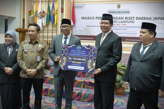 BANDARLAMPUNG- Ditengah suasana kebahagian Pemprov Lampung dengan hadirnya Majelis Pertimbangan Riset Daerah (MPRD). UIN Raden Intan Lampung menggugah semua kalangan dengan menggelontorkan sumbangan pembangunan masjid Al Hijriah sebesar Rp 150 juta.
